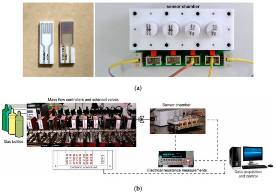 (a) Details about electrical connections of the sensor chamber and sensor layout; (b) Gas mixing system workbench with data acquisition.