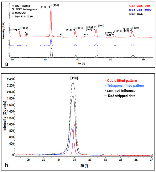 The XRD spectrum in Figure 3a presents all diffraction peaks related to the BST phase. In general, the sample related contribution to the diffraction peak profiles is often described as a combination of Gauss and Lorentz (Cauchy) functions. When viewing the profile of the peaks, it is clear that they are affected by the influence of two or more phases. Thus, in Figure 3b, we present the fitted patterns of both cubic and tetragonal peaks related to the [110] crystallized plane, which precisely explains the peak profile and shape. This clearly indicates the presence of both structures.