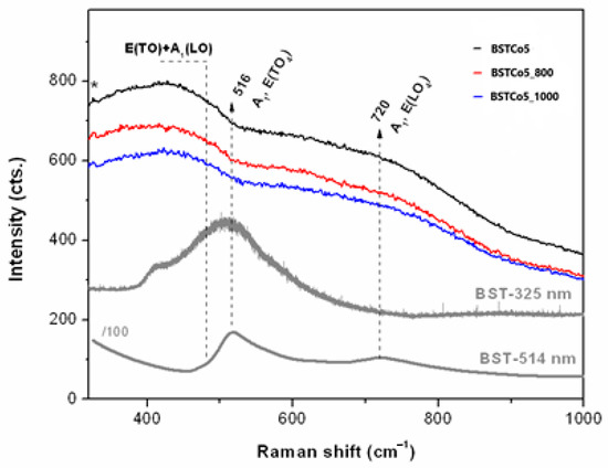 UV Raman spectra of the Co-doped BaSrTiO3 were compared with those of pure BST in order to investigate the Co dopant influence on the BST structure, as illustrated in Figure 4. Both pure BST and BSTCo5 were synthesized under the same conditions.