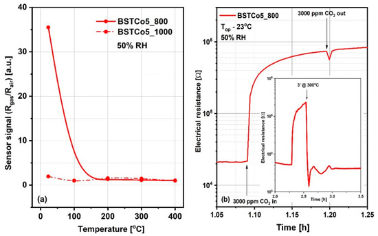It is generally accepted knowledge that, for chemo-resistive sensors, the chemical interactions of gases are modulated by the temperature of the sensitive layers and determine the variation of their electrical resistance. Thus, the preliminary selection between BSTCo5_800 and BSTCo5_1000 sensors was assessed for a fixed CO2 concentration of 3000 ppm in the temperature range of room temperature (RT) between 23 and 400 °C. CO2 was dosed into synthetic airflow with 50% RH, an atmosphere similar to in-field background (real operating conditions). Accordingly, the sensor signal, defined as the relative measure of the sensitive layer resistance under CO2 exposure (Rgas) with respect to the reference atmosphere (Rair), is represented in Figure 8a. As can be seen, the highest signal is obtained for the BSTCo5_800 layer at room temperature (RT = 23 °C). A possible explanation is related to the specific structure and morphology of the samples inducing specific surface defects [46]. Despite the magnitude of the signal greater than 30 and the good response time, the electrical resistance of the BSTCo5_800 layer does not return to its initial value after exposure to CO2, most likely due to the formation of irreversible carbonic acid at the surface (Figure 8b). A short temperature boost of 3 min (‘) at 300 °C ensures the cleaning of the surface and the return of the resistance, as seen in the inset from Figure 8b.