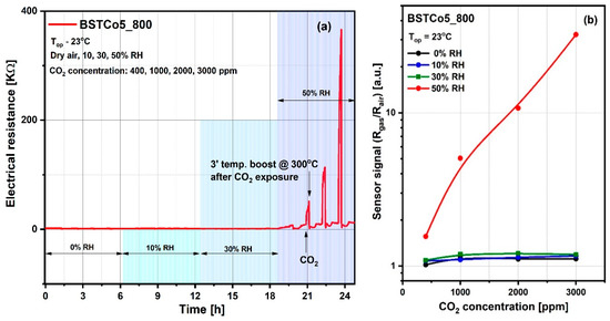 (a) Variations in electrical resistance for BSTCo5_800 due to exposure to CO2 in atmospheres with variable relative humidity (0%, 10%, 30%, and 50% RH); (b) The sensor signal for 400–3000 ppm of CO2 under different relative humidity background conditions.