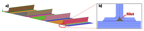 The model geometry used for the simulation is composed by the stiffened panel and a resin distribution medium placed at the bottom of the panel. In order to reduce the simulation time, a geometry smaller (100 × 559 mm2) than the actual geometry (813 × 559 mm2) has been simulated. The mesh size has been set to 0.6 × 4 × 0.6 mm3 for the resin distribution medium and 0.6 × 4 × 0.2 mm3 for the preform, i.e., the height of the mesh element corresponds to the thickness of each carbon fiber ply. A front view of the mesh is reported in Figure 9a, while in Figure 9b, a particular of the mesh adopted for the base panel is shown.