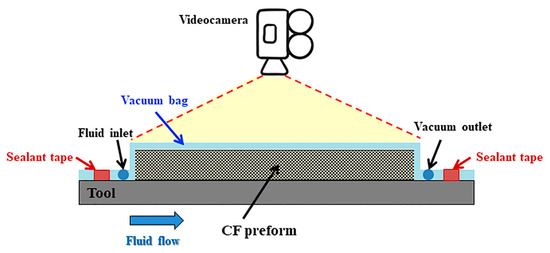 In-plane permeability measurements of the carbon fiber preforms and the distribution medium were carried out by the unidirectional flow method at constant injection pressure [37,38,39]. Both carbon fiber (CF) preforms (70 × 60 × 8 mm3) and distribution medium specimens (70 × 60 × 0.6 mm3) were tested. As sketched in Figure 2, the dry carbon fiber preform (or the distribution medium) was placed on a steel tool and covered by a vacuum bag film (Securlon L-500Y produced by Airtech Europe Sarl, Differdange, Luxembourg). A silicone seal was used to avoid any leakage during the measurement. The vacuum line was connected to a resin trap, a vacuum pump, and a pressure transducer.