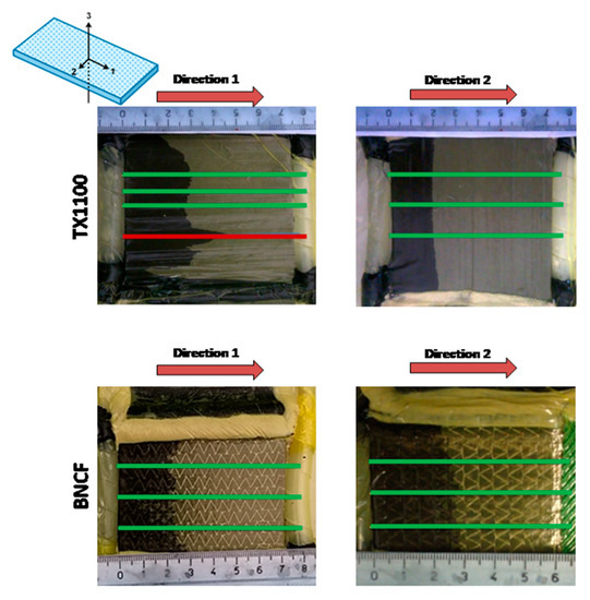 Some frames of flow front monitoring for the in-plane permeability measurement are shown in Figure 4. The in-plane permeability measurements have been carried out along the directions 1 and 2 of a unidirectional preform, i.e., across in-plane directions. For each preform and flow direction, the flow front position has been obtained as the mean value among those measured along three different measurement lines, evidenced by green lines in Figure 4. As observable in Figure 4, the measurement lines have been chosen in correspondence of a homogenous flow front and far from the edge zones and the race tracking zones (as evidenced by the red line for the TX1100 preform).