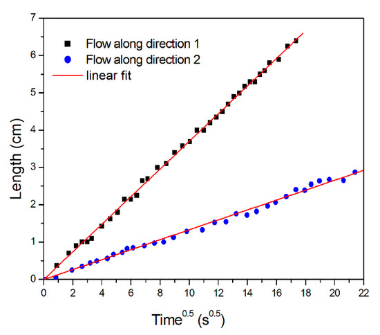where η is the fluid viscosity, Vf the fiber volume fraction, ΔP the pressure drop between the inlet and the flow front, and t the infusion time. A plot of the flow front position xf as a function of the square root of the time is characterized by a linear behavior, as shown in Figure 5, along the two directions 1 and 2. In-plane permeability Ki along in-plane directions 1 and 2 is obtained from the slope of the linear fitting of data reported in Figure 5 as:
