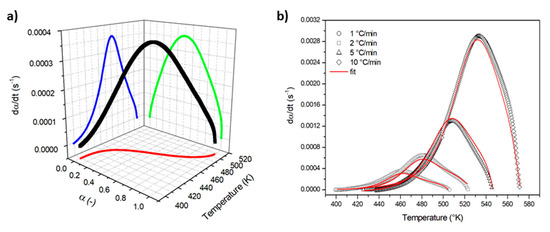 (a) 3D plot of the reaction rate dα/dt at 1 °C/min as a function of the temperature and the degree of reaction α; (b) comparison of experimental reaction rate and Equation (8) predictions.
