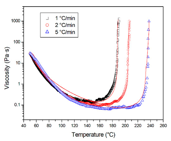 Viscosity plots for the PRISM EP 2400 resin at different heating rates. The red line represents the fitting according to the modified Kenny and Opalicki model.