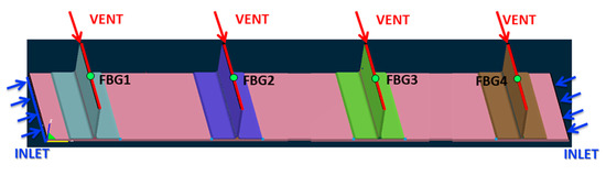 The injection system is detailed in Figure 10. Two resin inlets, made of omega flow tubes, are placed symmetrically on the lateral sides of the base plate, as evidenced by the blue lines. Resin vents, evinced by red lines, are on the top of the stringers. The boundary conditions were ambient pressure at the inlet port and vacuum pressure at the vent port and ∂P/∂n = 0 at the mold and vacuum bag side. The simulation automatically stopped when all the elements were filled.