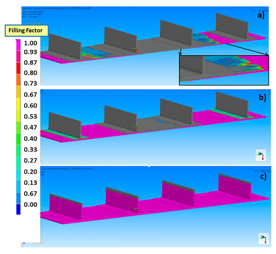 Different filling stages of the stiffened panel at 100 °C and 0.98 bar for different times: (a) 130 s, (b) 220 s, (c) 700 s.