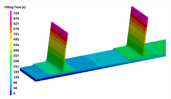 As an example of the simulation output, the filling time at 0.9 bar and 100 °C is reported in Figure 12, where only half the component is shown in order to clearly observe the differences. The base panel is filled after 340 s, while the top of the stringer is after 724 s. Since the stringers are filled with an in-plane resin flow, its filling is relatively faster than that of the base panel, where the flow advances mostly through the thickness, where the out of plane K3 permeability of the preform is about two orders of magnitude lower than the in-plane K1 permeability.