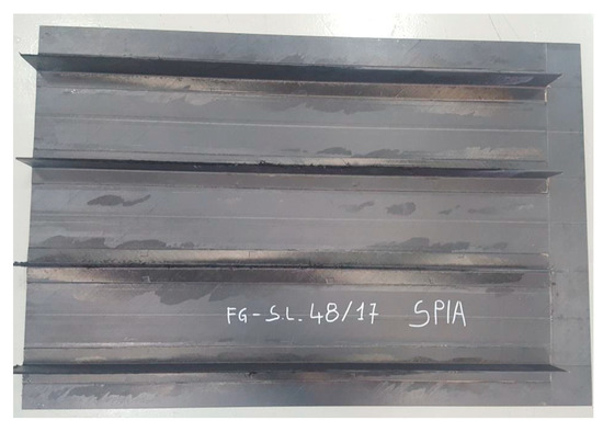 The studied component, representative of an aeronautic structural element, is a flat laminate stiffened by four stringers (Figure 1a). The lay-up of the laminate (813 × 559 × 2.4 mm3) was [45/90/0/±45]2 and that of the stringers (813 × 88.5 × 38 mm3) was [45/−45/0/90/0/−45/45]. Both the flat laminate and the stringers were made by resin infusion in intermediate modulus carbon fiber preforms obtained by a unidirectional TX 1100 IMS65 24k fabric (Solvay S.A., Bruxelles, Belgium), prepared by automated fiber placement (AFP) of unidirectional tapes. The fillet of the stringer, evidenced in Figure 1b, was made of BNFC-24k IMS-(0)-196-600 (Solvay S.A., Bruxelles, Belgium) fabric with 0° orientation. The nominal thickness of both carbon fiber tapes was 0.2 mm, the areal weight was 200 g/m2, and the elastic modulus was 290 GPa, as reported in the technical datasheet.