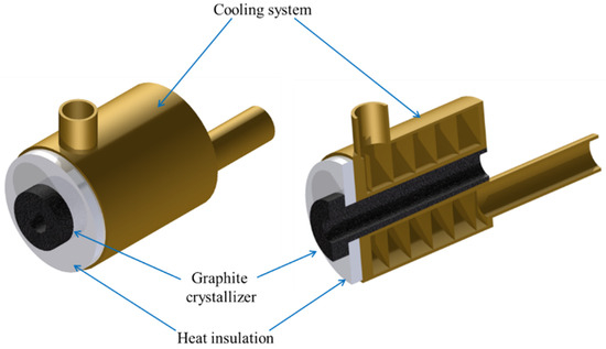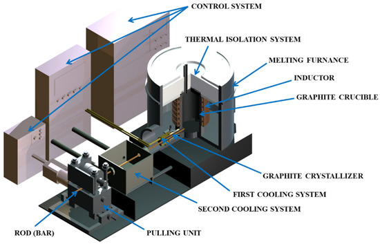 As part of the experimental study metallurgical synthesis of selected copper and magnesium alloys was conducted. It was established that the OF granulated copper (99.99% of Cu) and magnesium (99.9% of Mg) have been used in the metallurgical synthesis process. The melting and homogenizing process was conducted in graphite crucible of the melting and casting furnace (Figure 1) (Termetal, Piekary Śląskie, Poland) at 1250 °C and the crystallization occurred throughout the horizontal continuous casting process in the graphite crystallizer with a diameter of 14 mm with a constant primary cooling (Figure 2). The nominal power of the furnace is 20 kW and the frequency of the induction coil is 3 kHz. Because of the stable cooling conditions and unchanging temperature of the melted metal it was possible to determine the influence of the casting parameters on the selected properties of two-phase CuMg alloys. The alloys with 4.5% and 5% of wt.% of Mg casted with fixed standstill of 2 s and varied feed of 2 mm and 4 mm were evaluated. The continuous casting parameters along with the selected alloys’ compositions (at the top of the table) and the actual measured chemical compositions (at the bottom of the table) and measured density are presented in Table 1.