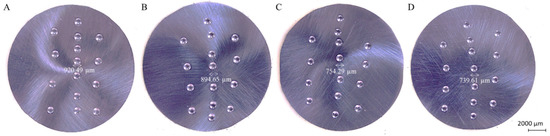 Exemplary pictures of indentations obtained in Brinell’s hardness tests; (A) CuMg4.5 sample casted with 2 mm feed; (B) CuMg4.5 sample casted with 4 mm feed, (C) CuMg5 samples casted with 2 mm feed, (D) CuMg5 samples casted with 4 mm feed.