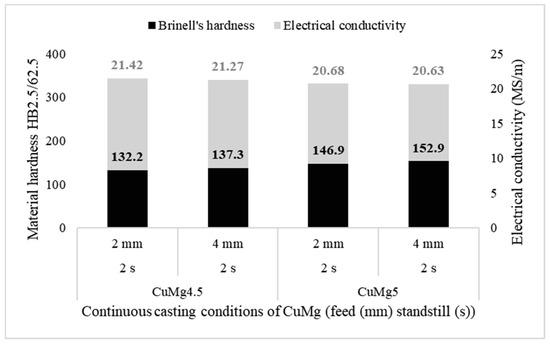 Electrical and mechanical properties analysis was conducted based on the electrical conductivity research and the Brinell’s hardness test conducted afterwards. Pictures of exemplary samples after hardness tests are presented in Figure 3 with measured diameters of the middle indentations. Mean values of the obtained research results of the as-cast samples are put together in Figure 4. There were no significant macroscopic differences recorded between the conducted indentations at the cross-section of the cast rod.