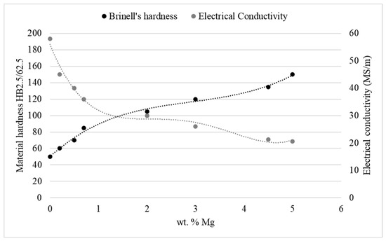 The calculated standard deviation values were between 0.49 and 1.16 in the case of the hardness tests and 0.24 and 0.47 in the case of the electrical conductivity measurements. Based on this it may be stated that macroscopic properties such as hardness and electrical conductivity were repeatable in the case of tested samples. It might be easily stated that as the magnesium content increases in the alloy its electrical conductivity decreases, which is described by the Nordheim’s rule and the rule of mixture. There is no significant influence of the casting feed on the obtained results. The measured values are slightly lower (up to 0.15 MS/m) in the case of the alloys casted with 4-mm feed, however, these values might be neglected because of an experimental accuracy. The increase of the magnesium wt.% from 4.5% to 5% caused the decrease of the electrical conductivity from approximately 21.42 MS/s to approximately 20.63 MS/m. It is worth noting, that according to the accessible research papers the electrical conductivity decrease is significantly higher when considering single-phase CuMg alloys i.e., from starting value of 58 MS/m (Cu) to some of the commercial CuMg alloys and others which were the focus of the scientists in [21,28,29] as presented collectively along with the research results obtained in this research paper in Figure 5. Increasing concentration of magnesium in copper solution in terms of two-phase materials caused the decrease in the electrical conductivity due to the increasing volume fraction of Cu2Mg intermetallic phase.