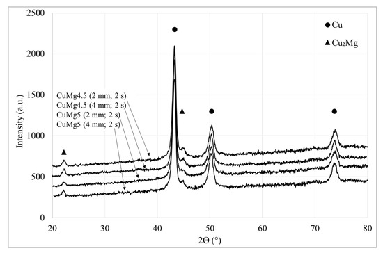 The phase constitution of CuMg alloy powders obtained by XRD patterns is shown in Figure 6. The marked peaks clearly show the presence of Cu α phase in accordance with No. Card ICDD 00-004-0836 and Cu2Mg β phase in accordance with No. Card ICDD 00-058-0360.
