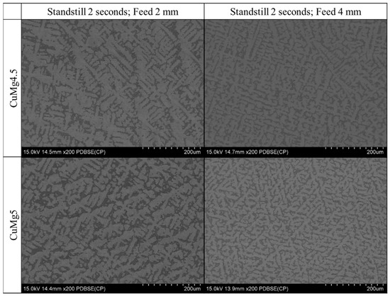 Figure 7 depicts the pictures of the microstructure of CuMg alloys obtained with backscatter electrons using SEM analysis. A clear difference is visible between CuMg4.5 and CuMg5 as there is much more Cu + Cu2Mg phase present in the Cu matrix as the magnesium content increases. Moreover, there is a significant difference in the packing of the Cu + Cu2Mg phase, as the eutectic particles form smaller but much more denser aggregates forming more grain boundary, which might explain the differences in the electrical conductivity (slightly lower with higher casting feed) and materials hardness (slightly higher with higher casting feed).