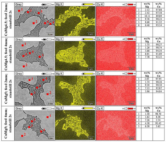 Additional analysis conducted with SEM microscope is presented at Figure 8 along with chemical composition analysis (element mapping and point analysis). Images were obtained using backscattered electrons which based on the atomic number of the element provides specific image (the darker area for elements with lower atomic number). Chemical composition was determined using EDX detector which provides the information on the alloy matrix and precipitations based on the obtained spectrum of the alloy which allows, based on the intensity, to provide the quantitative and qualitative analysis and element mapping of the alloys. The dark areas in the pictures marked as grey show magnesium-rich phases and the bright areas show copper-rich phases.