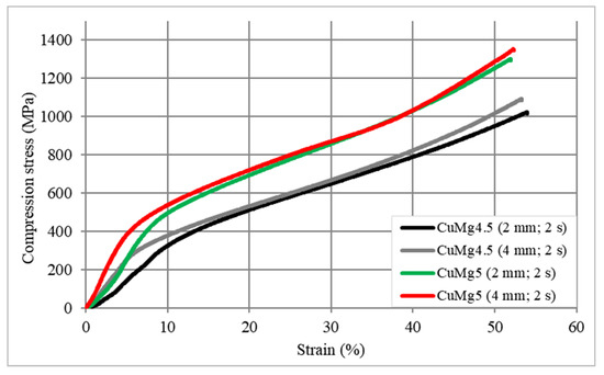 A final stage of this research was to determine the influence of the strain hardening on the tested CuMg samples in the static compression test. The exemplary stress–strain curves are presented in Figure 9 where it is clearly visible that the stress required to obtain 50% deformation is significantly higher (approximately 300 MPa difference) when considering samples with higher magnesium content which is in consistence with the hardness results of the as-cast state samples measured in this research. There is a slight difference in the compression stress–strain curves regarding the casting feed especially up to the yield strength of the tested samples, however, afterwards the curves have more or less similar course.