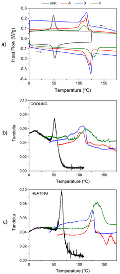 DSC analysis results (a) and DMTA curves vs. temperature in heating (b) and cooling stage (c) for the investigated samples.