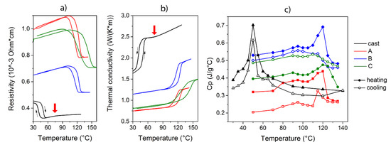 Resistivity vs. Temperature measurement (a), calculated thermal conductivity vs. Temperature (b) and specific heat vs. Temperature measurement (c) for the investigated samples. The red arrows in (a,b) indicate the change in slope observed for cast sample.