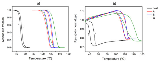 The hysteresis cycles reported in Figure 8a were evaluated by integration of the DSC peaks related to the thermoelastic transformation. In this way, it was possible to obtain the evolution of the martensite volume fraction during the transformation. The thermal hysteresis derived from DSC was compared to the hysteresis measured during the resistivity measurements normalized with respect to the resistivity value at 30 °C reported in Figure 8b.