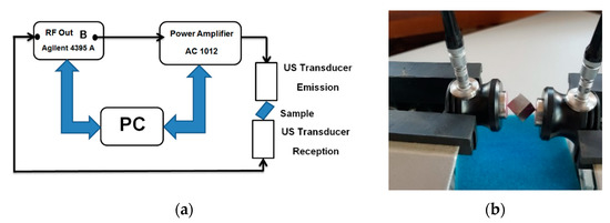 RUS was employed to evaluate the quality of the studied samples. RUS implies the exploration of the resonant structure of a compact sample on the basis of resonance frequency modification according to ASTM E2001-18 [24], for the detection and assessment of variations and mechanical properties of a test object. RUS techniques can employ small samples, where the evaluation is made from the entire volume; the method can also be applied for phase transition studies [25]. The resonance frequencies depend on mechanical properties (size, shape, density) and on the sample’s elasticity. Most resonance frequencies of a cube do not respond to analytical solutions, even if it is isotropic. However, there are analytical solutions offered by Mindlin-Lamé [26] and Damarest, whose formulations offer the possibility to manage anisotropy. For small samples of the order of centimeters, RUS is applicable for allowing the connection of low frequency stress strain methods and ultrasound time delay. Each frequency corresponds to a propagating wave beam, the maximum of resonance modes having 1/f period. (f is the resonance frequency). RUS is frequently combined with Finite Element Analysis (FEA) to identify the resonance frequency, fr. Typically, in conventional RUS, the sample is fixed between the sensors by “edge-to edge” contact [27], assuring a weak coupling with the sensors. An emission transducer (US Em) and a receiver transducer (US Re) type P111.O.06P3.1 with high bandwidth were used to carry out the experiment. The experimental assembly included an Agilent 4395A Network/Spectrum/Analyzer generating a frequency sweep in 1 kHz steps between 120–200 kHz, as shown in Figure 1.