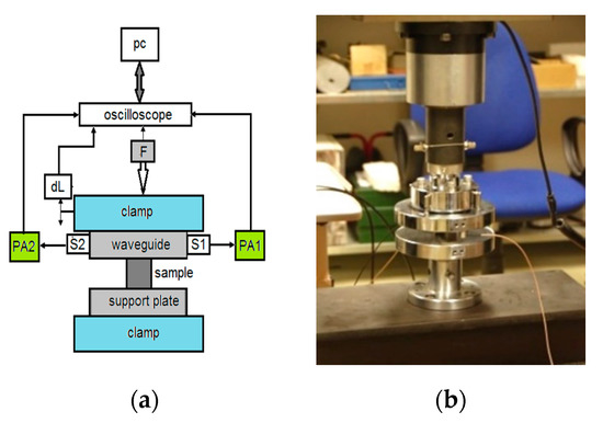 The strength of materials can be predicted by recording the AE events from the initiation of microcracks [15,31,32,33]. The AE sensors (two DAEL IDK09) could not be applied directly to the sample, due its small dimensions, thus, they were glued onto support plates, acting as waveguides (Figure 2).