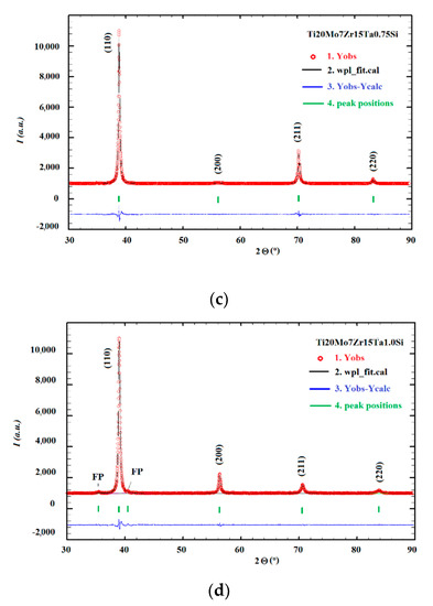 Table 2 shows the Si concentration (x), average size of crystalline blocks (D), the value of microstrains (ε), lattice constants observed (a) and calculated (acalc), and unit cell volume (V) [16]. Here, Bo represents the covalent bond strength and Md represents metal d-orbital energy level for TiMo20Zr7Ta15Six (x = 0.0; 0.5; 0.75; 1.0) alloy samples at room temperature. Table 3 presents the atomic concentration of alloying elements, and lattice constants and densities calculated using PowderCell and/or FullProf programs. The lattice constants were calculated from the number of atoms on the main diagonal of the elementary cell.