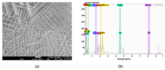 It is also observed that, in addition to the structural body of the main dendrite with a white contrast, these structures appear with an inhomogeneous light gray contrast near the black regions visible in the Figure 4 EDS maps. These trends of microstructures can be explained by the tendency of Ti and Zr to be abundant in the inter-dendritic region [43], (as well as the tendency of Ta and Mo to be more abundant in dendrites).