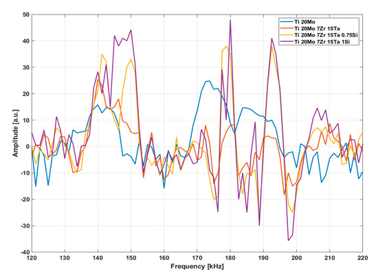 It can be observed that with the increase in Si content of over 0.75 wt.%, the frequency spectrum modifies its amplitude and shape and sharp peaks appear, which is specific to Si present in a Ti matrix, which is in good correlation with the values presented in Table 1. In addition, this denotes a modification of grain structure that seems to slightly decrease with the increase in Si content and leads to increasing hardness (Table 2). This modification of the structure, smaller than that of pure Ti, may be due to the hardening of the solid solution induced by the addition of Mo. The results show that the mechanical properties for the alloys were improved when the addition of Si was up to 0.75 wt.%.