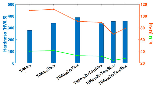 Ti and Mo are compatible elements that, when combined, can form binary alloys leading to stable crystal structures, optimal for biomedical integration. Part of the elements used for titanium alloys ensure β stabilization, such as Mo (which improves the tensile strength of creep) [10] or Si (which improves the creep and oxidation properties). The β-phase proportion in Ti alloys affects the mechanical and corrosive properties [11,12], therefore, a compromise needs to be achieved between strength and plasticity, by alloying the TiMoSi ternary alloy with stabilizing elements for medical prostheses [13]. Previously published studies [14,15] focused on determining the properties of TiMoySix alloys with x = 0; 0.5; 0.75; 1.0 and y = 15; 20; 25, and showed that Mo assures the stability of β-Ti (spatial group Im–3m) by lowering the transition temperature of α-Ti to β-Ti to ambient temperature [16], and ensuring a fine structure of titanium alloy. TiMoZrTaSi takes part from the new generation of metallic biomaterials labeled high-entropy alloys (HEAs) [17], that assure both biocompatibility as well as improved mechanical properties required by further medical applications. Zr and Ta act as consolidation elements: the alloying with Zr leads to an α crystalline structure which increases the mechanical strength and assures a good electrochemical behavior; Ta is a β stabilizer sustaining the formation of solid β-phases in the titanium alloy. The addition of Ta contributes to the improving of tensile strength and the decrease in the Young modulus.