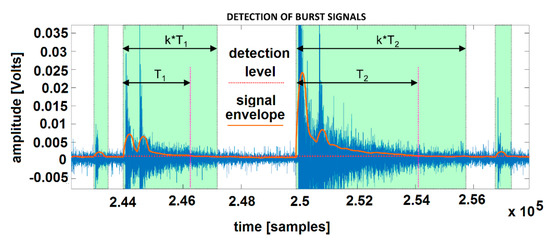 To illustrate the spectral content of burst AE signals, an approach has been developed (described below), solving the problem of the extraction of AE hits, which can be relatively noisy and time-overlapping. As a simple tool, the thresholding of the signal envelope was performed (Figure 8). The continuous signal envelope was calculated as the convolution of the originally sampled signal with the Hamming window of an appropriately chosen length. AE hit impact was then defined as a signal part (light-green colored in Figure 8) corresponding to the multiple of time period T, in which the signal envelope was higher than detection level (set slightly above the noise). Multiplication coefficient, k, was set around the value k = 1.3 to capture the AE hit impact decay as well.