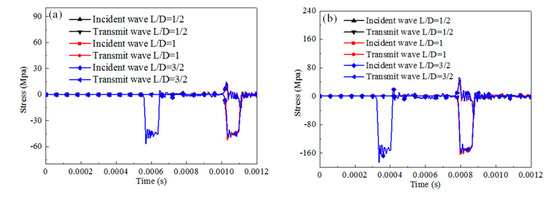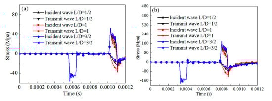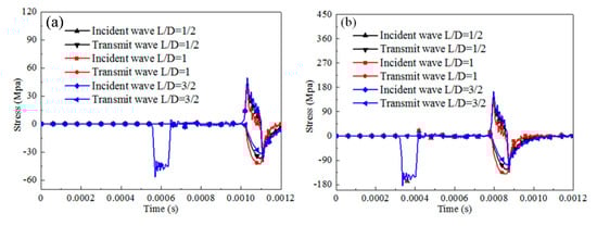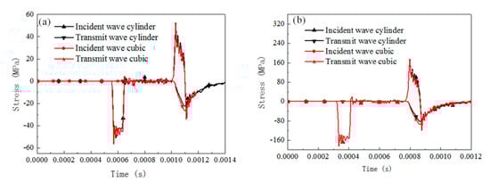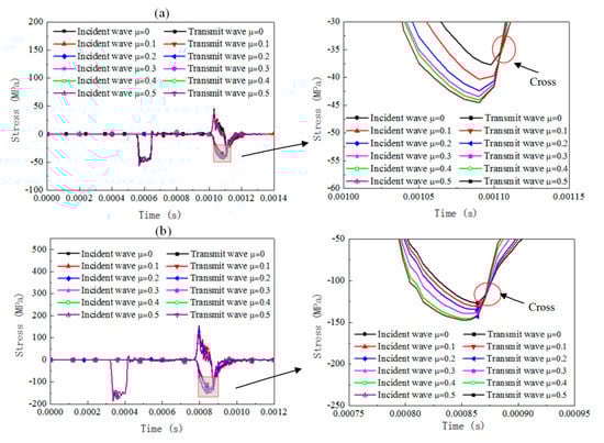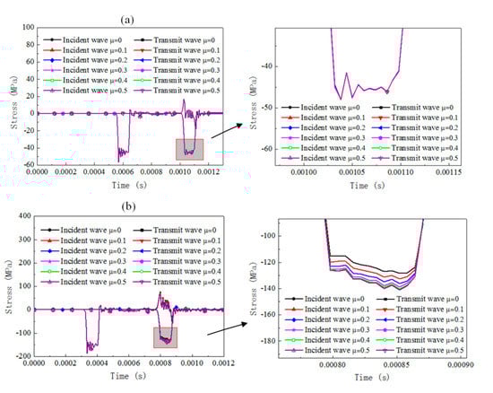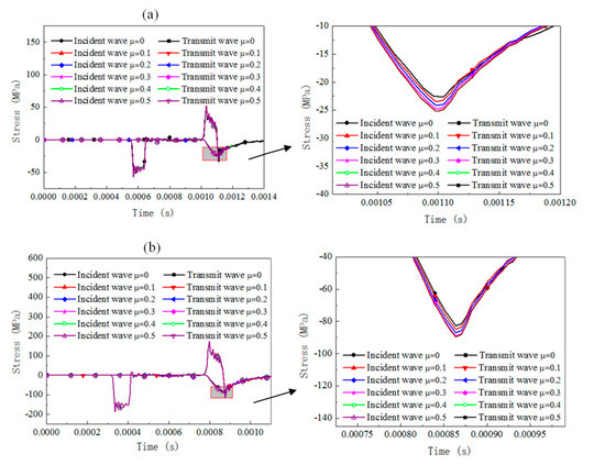 Figure 3a,b). The friction coefficients are set between 0 and 0.5 with an increment of 0.1. Here, 0 represents ideal lubrication and 0.5 is a large friction coefficient. The range 0–0.5 can cover the possible range of friction coefficients in SHPB tests [