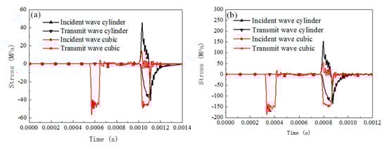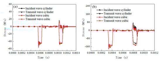 Since the geometries of bars and specimens are axisymmetric, a quarter of the model was used throughout the simulation work. Both the incident bar and transmit bar are 2000 mm long and modelled with 494,400 C3D8R elements. The striker is 200 mm long with 30,800 C3D8R elements. The dynamic load is applied by imposing the initial velocity on the striker. Two initial impact velocities are considered: 3 and 10 m/s. The stress waves are recorded by the strain gauges as the position in the experiments. Surface-to-surface contact is set between the specimen and bars to prevent interpenetration. Two specimen shapes are considered: a cylinder specimen and a cubic specimen (