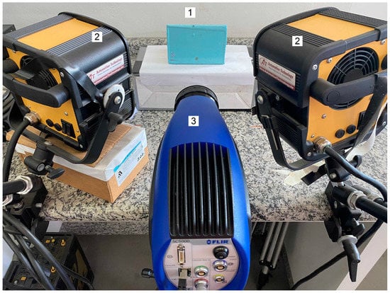 Photography illustrating the positioning of the equipment during the performance of the experimental tests: 1—sample, 2—halogen lamps and 3—infrared camera.