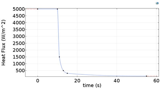 where is the heat flux incident on the sample surface due to the heating time. To obtain the function corresponding to this heat flow inserted in the sample surface that is not trivial, therefore, in this study, several simulations were carried out to analyze parameters that influence this function. Analyzing the results considering the heat flux and the heating time, it was decided to adopt a piecewise cubic interpolation, as shown in Figure 3. The main reason for this choice was based on the great similarity obtained in the cooling behavior of the lamps after the end of the heating period (from the time of 10 s on the horizontal axis of Figure 3).