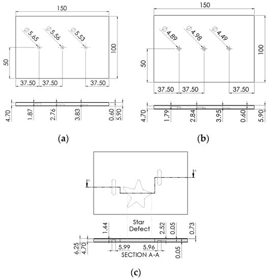 The virtual solid of each sample was constructed according to the geometry (substrate dimensions, coating and defects) of the actual samples. Figure 4 shows virtual solids of the samples evaluated in this study with the defects inserted.