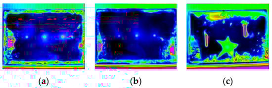 For each test, the camera was configured for image acquisition at a 50 Hz frame rate and for 60 s monitoring. Thus, for each test, a sequence of approximately 3000 thermograms was obtained. Figure 5 shows the highest thermal contrast thermogram obtained for each sequence.