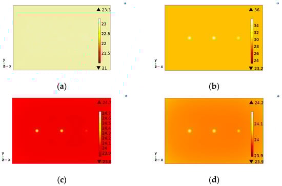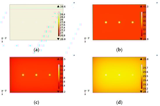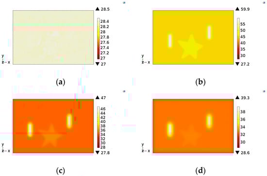 Images illustrating the temperature distribution on sample S1 obtained by the simulation model developed: (a) 0 s (at the moment that the lamps are turned on), (b) 10 s, (c) 20 s and (d) 30 s.
