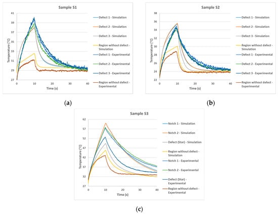Analyzing these images, all defects were detected, coherently with the experimental behavior. In addition, for sample S3, the adhesion failure (star) showed lower thermal contrast than the steel thickness loss (notches). This same behavior was observed in experimental results (Figure 5c). Therefore, the computational simulation model developed in this study showed a good correlation with thermograms obtained in the experimental tests. Even so, in addition to the comparison of obtained images, it was also considered necessary and important to evaluate the temperature evolution in defective and no defective regions obtained by the two methodologies (experimental and simulation). This comparison validates the efficiency of the developed model as a useful tool to virtually reproduce the PT inspection. Figure 9 shows the temperature evolution for the two methodologies in the evaluated samples.