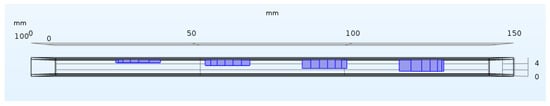 Cross section of the virtual solid illustrating defects of the same diameter with different depths (0.94, 1.88, 2.82 and 3.76 mm).