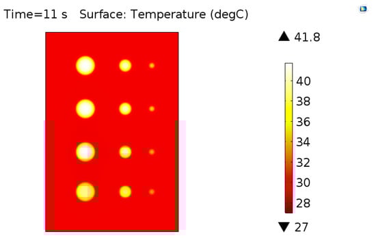 Figure 11 shows the image of the surface of the sample at the time of the highest thermal contrast of defects. Analyzing this result, it is possible to observe that all defects were detected and there was an influence on the thermal contrast relative to both the defect area and depth. For a more detailed analysis, this influence was evaluated numerically through the maximum thermal contrast values obtained for each defect contained in the virtual solid and these data are also expressed in graphical form in Figure 12.