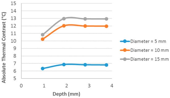 Absolute thermal contrast behavior for defects of: (a) 5 mm in diameter, (b) 10 mm in diameter and (c) 15 mm in diameter.