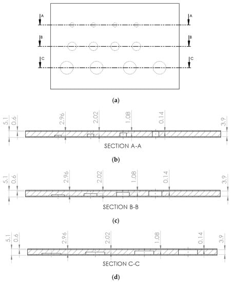 Table 4 shows the values of diameter and depth of the defects evaluated and their remaining thickness. Figure 13 shows the top view of the virtual solid used in this study and also the cut lines illustrating the positioning of the defects and the remaining thickness of them.