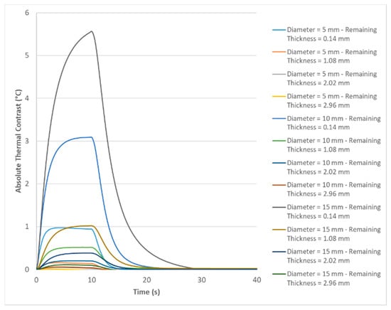 Evolution of absolute thermal contrast over time obtained by computational simulation for all defects contained in the sample (inspection performed on the opposite surface of the defects).