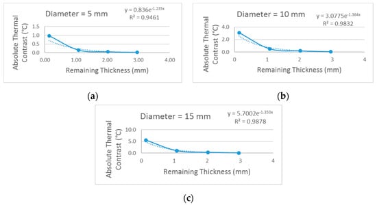 From the results obtained in Table 5, the reduction in the thermal contrast of the defects was evaluated as a function of the increase in the remaining thickness of the same, separating this analysis according to the diameter of the defects. These results are expressed in the graphs of Figure 16. In all three diameter sizes evaluated, a similar behavior was observed and in order to determine a function that best represents these data sets, adjustments were tested using functions linear, logarithmic, polynomial and exponential, among others. Adopting the value of R2 as a criterion for this evaluation, a parameter that represents the quality or efficiency of the model’s fit to the analyzed data, the best function obtained in all three defect diameters was the exponential function for presenting the largest R2 compared to other functions.