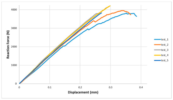 All of the tests were performed on electromechanical loading frame at room ambient temperature, and finally, the static tensile load was applied. Five tests were carried out under the same conditions for different but identical samples to guarantee the reliability of the results; as reported in the following Figure 1, the test was preceded until a maximum load was achieved and followed by a sudden load drop, indicating specimen failure characterized by a mix of adhesive and cohesive failures. The adhesive was shown to be very ductile (more than 20% shear strain to failure), so yielding and sustaining further load until eventually its shear strain failed was attained.