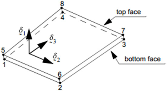 For the CZM technique, the tractions are a function of the relative displacements of the upper and lower edges, as seen in Figure 4; therefore, the relative displacements are in the normal direction and in the two cutting directions. Each relative displacement is then expressed in the distance between the centers of the faces or ends of the top and bottom element.