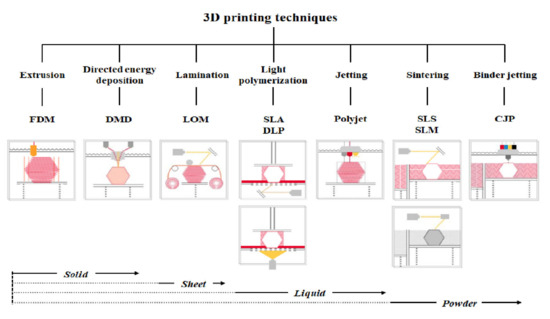3D printer hardware can be categorized into seven types according to their discriminative process, although innovative products are under development [3]. These types are extrusion, direct energy deposition, sheet lamination, light polymerization, jetting, sintering, and binder jetting. Representative 3D printers include fused deposition modeling (FDM) for extrusion, direct metal deposition (DMD) for direct energy deposition, laminated object manufacturing (LOM) for lamination, SLA and digital light processing (DLP) for light polymerization, color jet 3D printing (CJP) for binder jetting, polyjet for jetting, and selective laser sintering (SLS) and selective laser melting (SLM) for sintering (Figure 1) [22].
